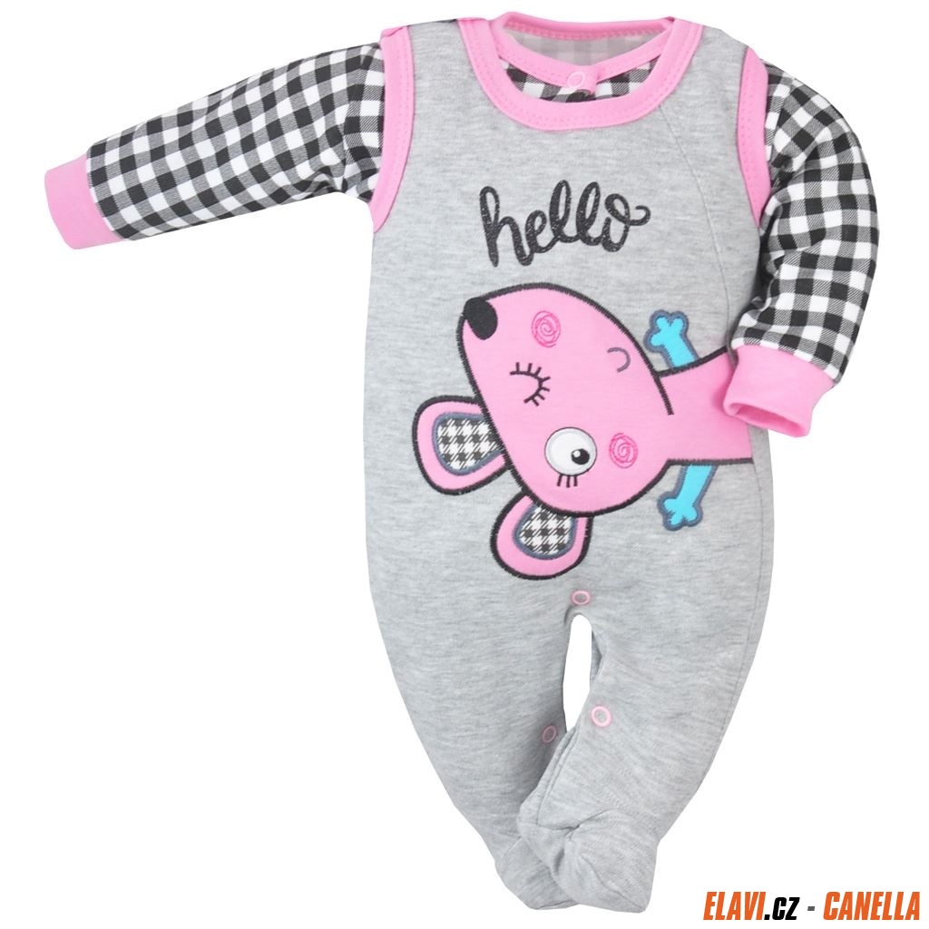 Součástí soupravičky jsou dupačky a kabátek. Dupačky jsou zdobeny obrázkem zvířátka. Mají praktické zapínání na cvočky na ramínkách a mezi nožičkami. Kabátek je károvaný a rozepínací po celé délce na cvočky. Okolo ručiček má široký lem.