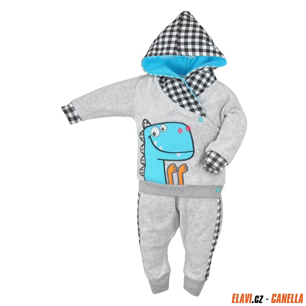 Kouzelná dětská bavlněná soupravička. Součástí soupravičky jsou tepláčky a mikina. Mikinka má boční zapínaní na cvočky po celé délce, široký lem v pase a na rukávcích a praktickou károvanou kapuci. Je zdobena obrázkem zvířátka. Tepláčky mají na nohavičkách široký lem a na boku ozdobné lemování.