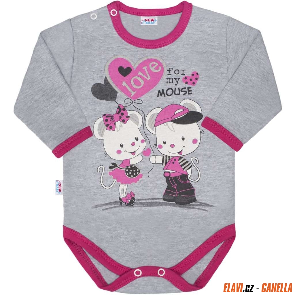 Bavlněné kojenecké body s dlouhým rukávem pro miminka. Dětské body je v krásné moderní barvě s barevným lemováním a je zdobeno obrázkem myšiček. Praktické zapínání na cvočky na ramínku a mezi nožičkami.