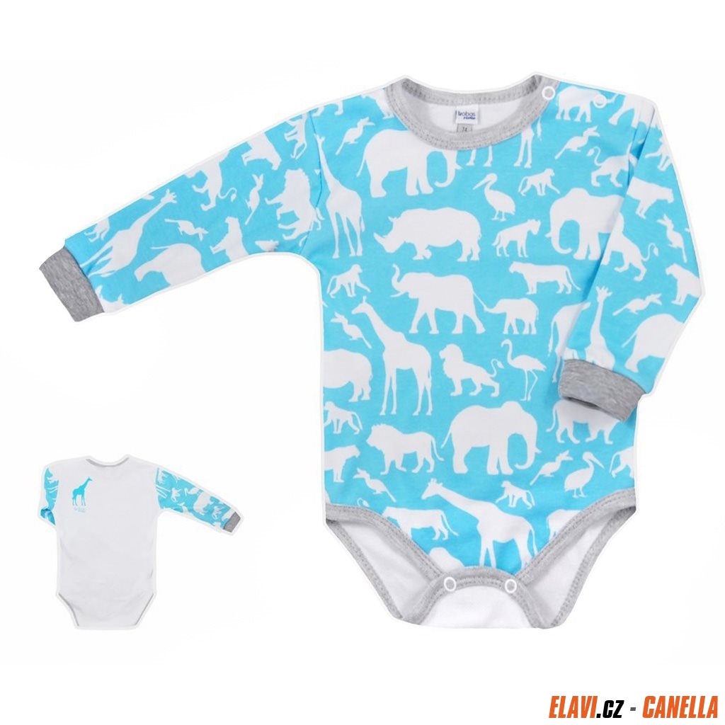 Bavlněné kojenecké body s dlouhým rukávem pro miminka. Dětské body je z přední strany celopotištěné zvířátkami z Afriky a zadní stranu zdobí obrázek žirafy. Má krásné zářivé barvy s výrazným motivem. Body má okolo krčku, nožiček a ručiček barevný lem. Praktické zapínání na cvočky po celé délce a mezi nožičkami velmi usnadní oblékání a přebalování.