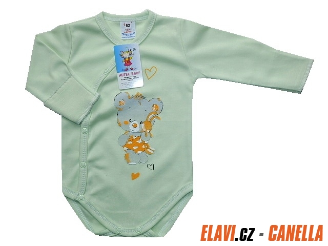 Luxusní kojenecké body se zapínáním vpředu. Body je opatřeno přehrnovacími rukávky.