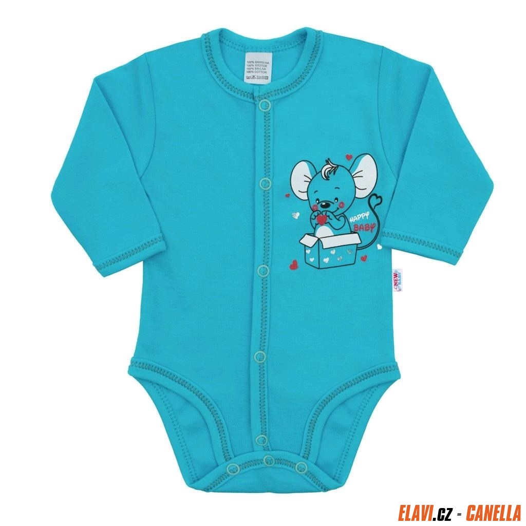 Kojenecké celorozepínací body s dlouhým rukávem New Baby Mouse. Body je zdobeno barevným lemováním a velkým obrázkem myšky. Zapínání na cvočky po celé délce a mezi nožičkami. Složení: 100% bavlna. Produkt české značky.