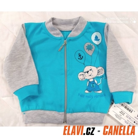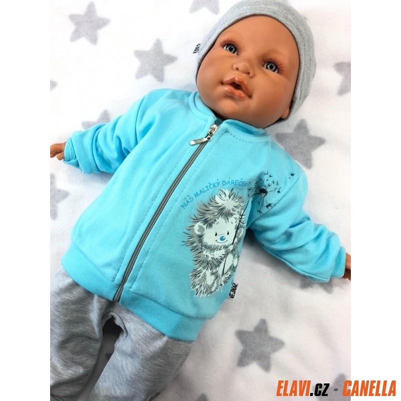 Luxusní moderní dětská bavlněná mikinka s tepláčky od české firmy. Mikinka má pohodlné zapínání na zip a rukávky jsou opatřeny praktickými manžetkami. Mikinku vpředu zdobí roztomilý obrázek. Tepláčky jsou jednobarevné tyrkysové. Český nápis Náš malý rarášek. Atestováno. Složení: 100% bavlna. Kvalitní český výrobek.