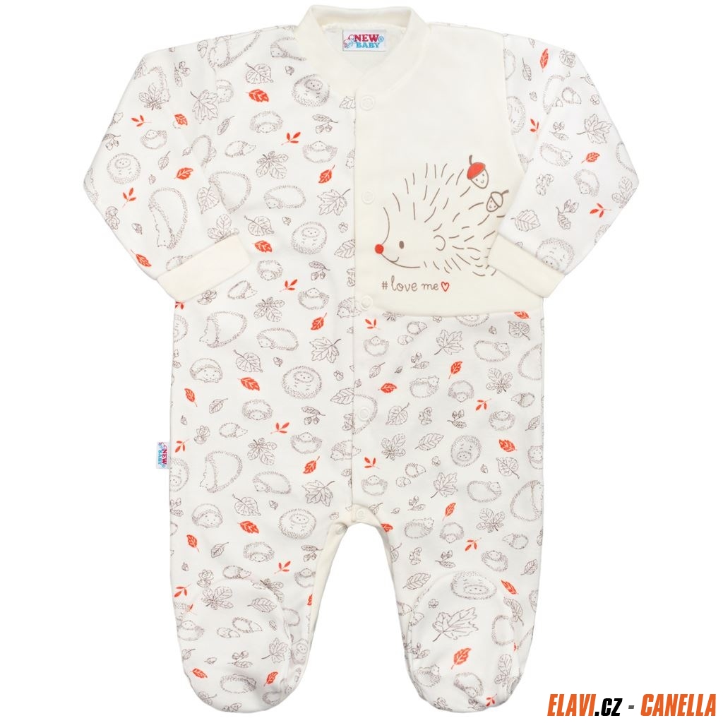 Kojenecký overal je zdoben barevným lemováním, potiskem s roztomilými ježečky, barevnými lístečky a velkým obrázkem ježečka. Zapíná se na cvočky po celé délce a mezi nožičkami. Velice kvalitní materiál.
