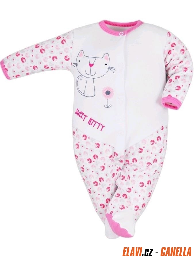 Dětský overálek má rukávky a spodní část celopotištěnou trojuhelníkama. Vrchní část je zdobena roztomilou liškou. Okolo krčku a ručiček je barevné lemování. Zapínání na cvočky po celé délce a mezi nožičkami usnadní oblékání a přebalování.