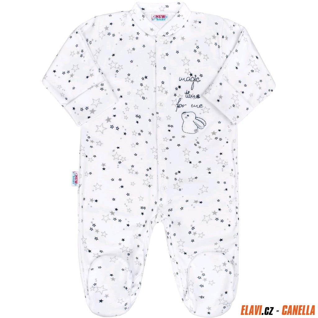Kojenecký overal je zdoben barevnými hvězdičkami, roztomilým obrázkem králíčka.