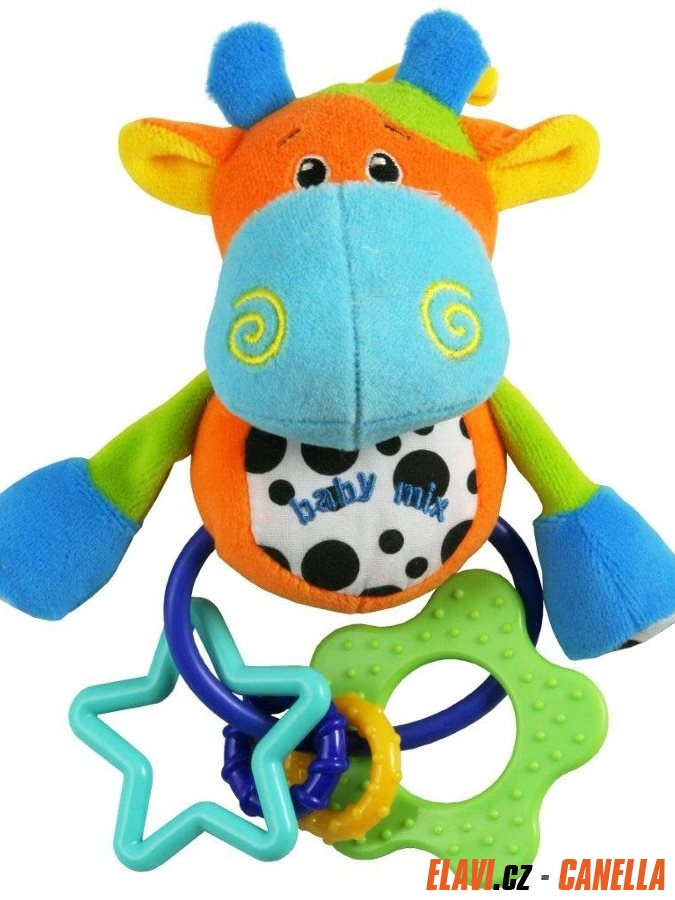 Barevná chrastící hračka pro miminka Baby Mix. Díky klipu se dá dětská hračka připevnit ke kočárku nebo postýlce.